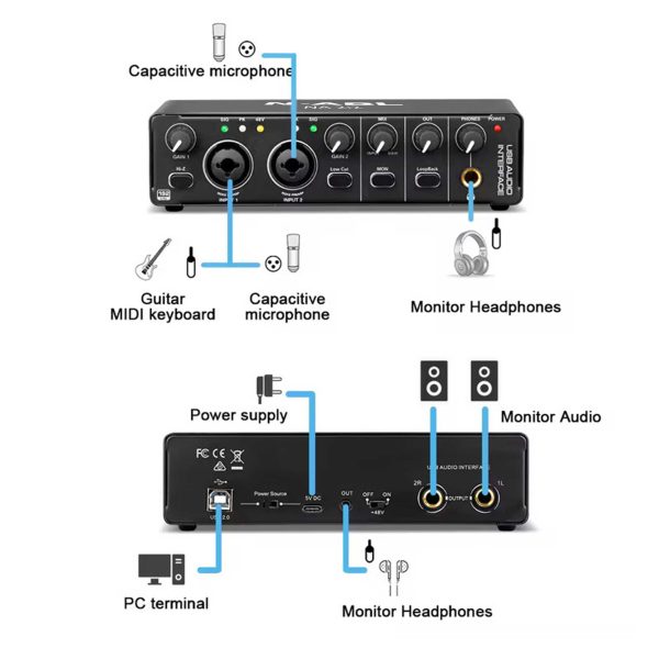 - [WIDE CONNECTIVITY]: 2×2 portable audio interface: 2 combo XLR/MIC/LINE inputs with phantom power and 2 independent TRS/TS stereo jacks to connect PA, monitors, amps & recorders. Connect 2 headphones simultaneously using 3.5mm or 6.35mm jack.